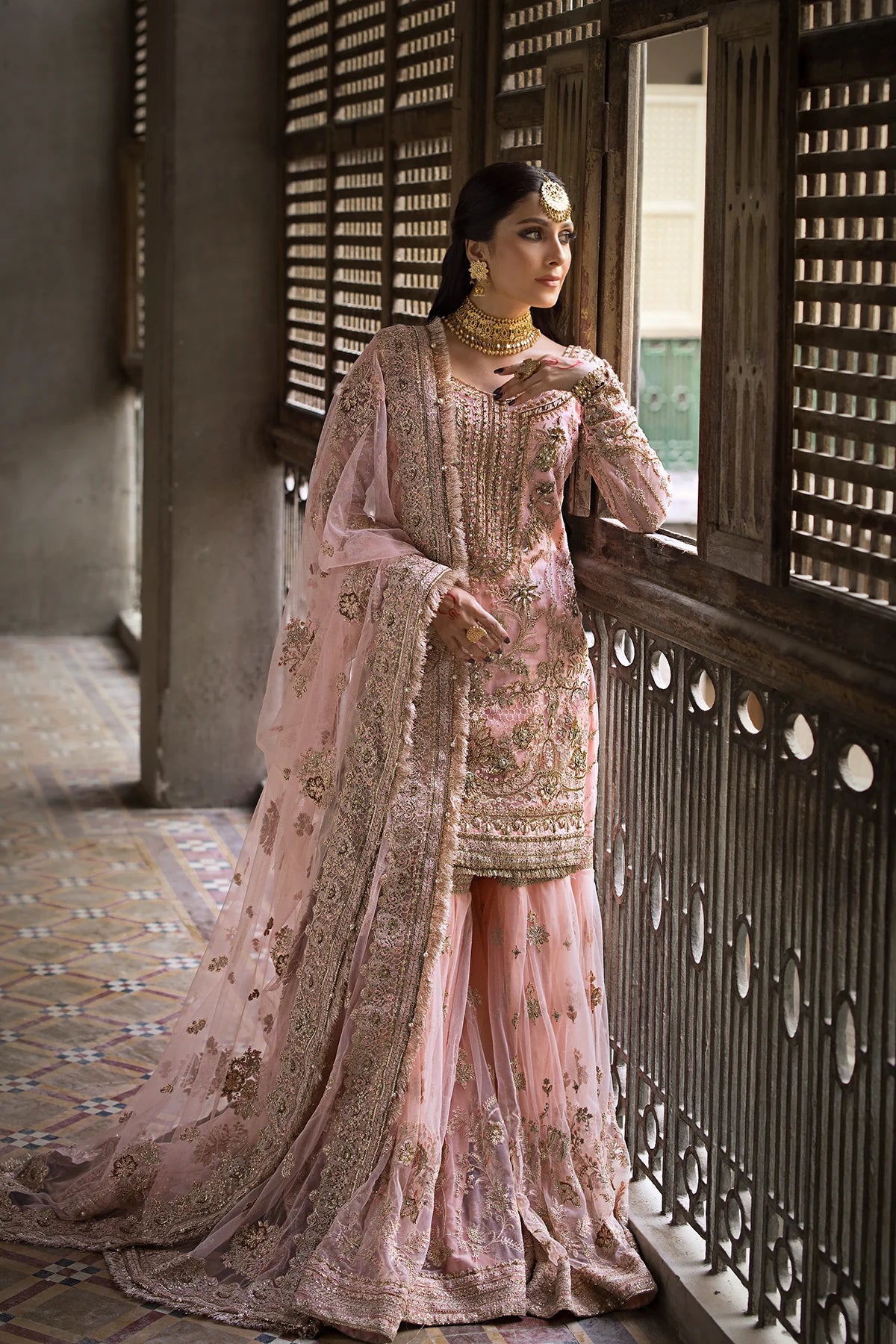Sahiba – this tea pink ensemble is donned with patterned motifs and bunches in hues of pink & coral threads, along with gold sequin and tilla work. Layered with pearls & naqshi. Paired with complementing organza dupatta and gharara with astounding details.